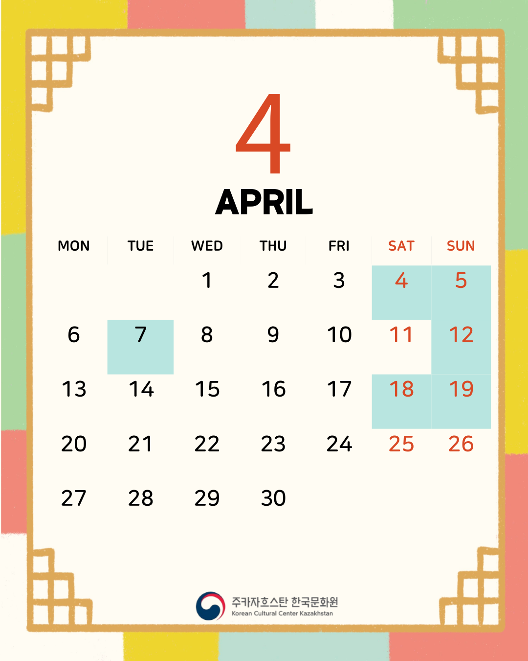 Корей мәдени орталығы 2026 жылғы сәуір айында өтетін іс-шаралардың кестесін ұсынады.