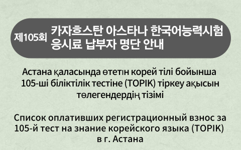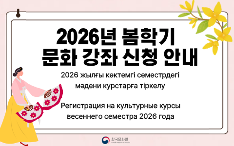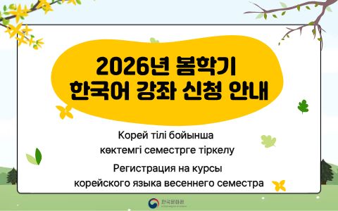 Корейский культурный центр объявляет о приеме заявок на курсы корейского языка весеннего семестра 2026 года. Период обучения: С 24 января (сб.) по 14 мая (чт.) 2026 года - Экзамен по оценке успеваемости запланирован на период с 9 по 14 мая, церемония вручения сертификатов состоится 15 мая. Пожалуйста, заранее обратите внимание на эти даты при регистрации. Сертификат выдается только при условии прохождения оценки успеваемости. Место проведения: Корейский культурный центр (г. Астана, ул. Иманова, 13) Требования к участникам: лица в возрасте от 13 лет и старше (дата рождения — не позднее 24 января 2013 года). Стоимость регистрационного взноса: 20 000 тенге Информация для регистрации новых слушателей (уровень 1A) 1. Предварительное тестирование уровня (если необходимо) 2. Посещение культурного центра для заполнения заявки 3. Оплата регистрационного взноса — Оплата принимается с 20 по 30 декабря 2025 г. (с 10:00 до 17:00) — Оплата регистрационного взноса не принимается в выходные дни, за исключением обеденного времени (12:30–13:30) и субботы, 20 декабря 2025г. — Регистрационный взнос можно оплатить только наличными (банковский перевод невозможен). — Новые слушатели могут пройти регистрацию только при личном посещении Культурного центра. Онлайн-регистрация недоступна. — Количество мест ограничено (по принципу приоритетной оплаты). Информация для регистрации действующих слушателей (уровень 1B и выше) 1. Ссылка для онлайн-регистрации: https://forms.gle/CTsqsB8qkahXaUVP9 2. Заполнение анкеты (бланк анкеты доступен для скачивания ниже) 3. Оплата регистрационного взноса и подача документов Необходимые документы для онлайн регистрации 1. Фотография паспортного образца — Размер: 3,5 × 4,5 см — Формат файла: JPG или PNG — Объём: не более 200 Кб 2. Личный адрес электронной почты (Gmail) — Обязательно использование одного аккаунта на человека; по возможности просьба регистрироваться с аккаунта, использованного в прошлом семестре. Период онлайн-регистрации: с 17:00 19 декабря (пт.) Сроки оплаты регистрационного взноса: — Оплата принимается с 20 по 30 декабря 2025 г. (с 10:00 до 17:00). — Оплата регистрационного взноса не принимается в выходные дни, за исключением обеденного времени (12:30–13:30) и субботы, 20 декабря 2025г. — Регистрационный взнос можно оплатить только наличными (банковский перевод невозможен). — Если регистрационный взнос не будет оплачен в установленные сроки, заявка, поданная онлайн, аннулируется. Количество мест ограничено, регистрация производится в порядке оплаты. Регистрационный взнос: — 20 000 тенге (после оплаты возврат невозможен) — Оплата только наличными (без банковских переводов) Информация о тестировании на определение уровня Кандидаты, не имеющие сертификата о завершении курса в King Sejong Institute, а также те, кто обучался в других организациях или не имеет действующего сертификата (полученного в течение последних 2 лет), обязаны пройти тестирование или предоставить подтверждающий сертификат, если планируют зарегистрироваться на уровень 1B и выше. Период проведения тестирования на определение уровня: — 20 декабря (сб.), с 10:30 до 16:30 (перерыв на обед: 12:30–13:30) — с 22 по 26 декабря, с 10:30 до 16:30 (перерыв на обед: 12:30–13:30) Предварительная запись на левел-тест: через Google Forms (https://forms.gle/mSvyukWiq48xRGWt5) или по телефону Культурного центра: +7-7172-901-113. — Запись осуществляется заранее — до дня, предшествующего тесту. Время проведен