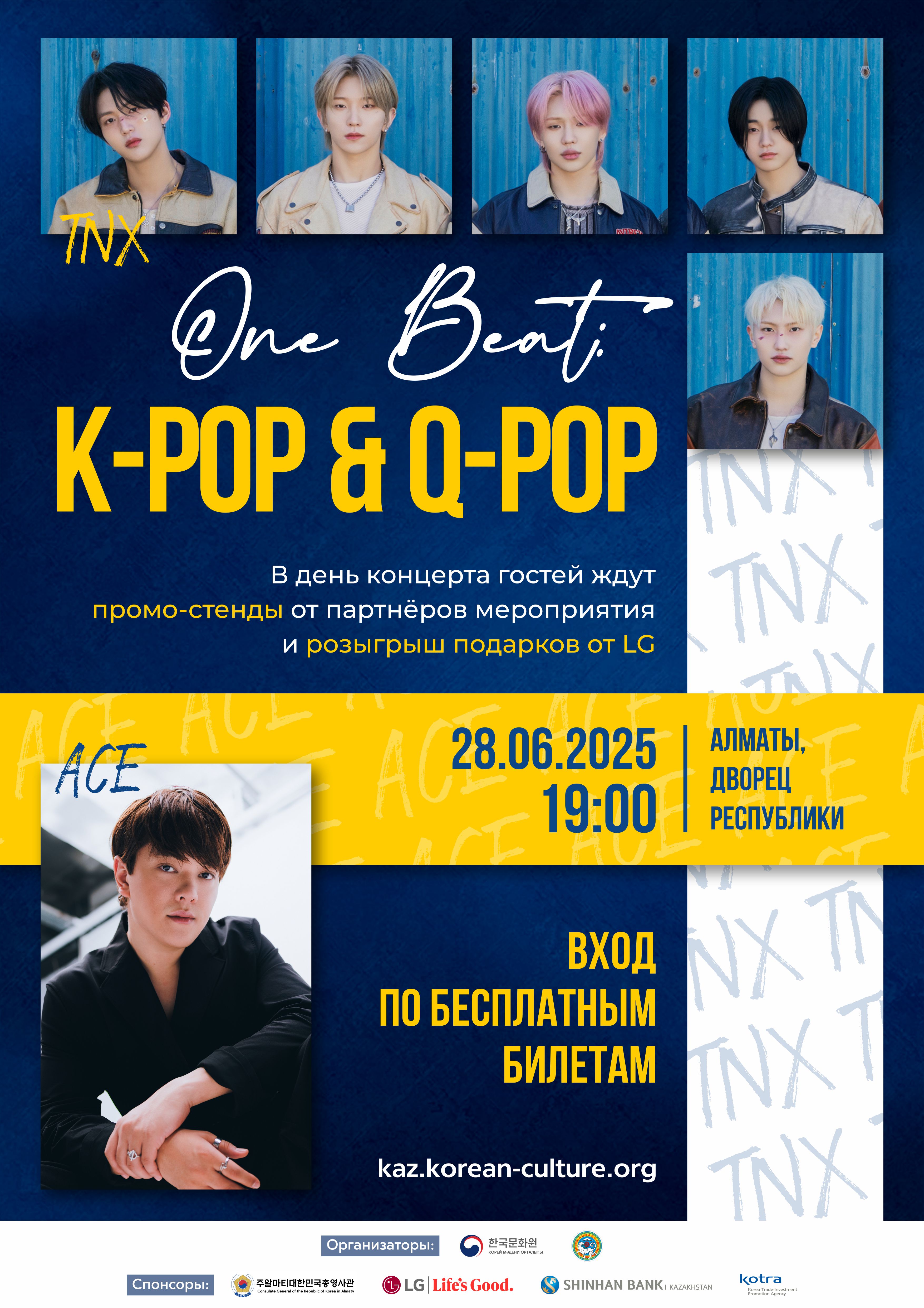 Уникальное слияние K-pop и Q-pop! 28 июня 2025 года (суббота) в Дворце Республики города Алматы состоится грандиозный концерт K-pop & Q-pop. На сцену выйдут K-pop группа TNX и Q-pop артист ACE (участник группы Ninety One), чтобы подарить зрителям яркое и энергичное выступление.
